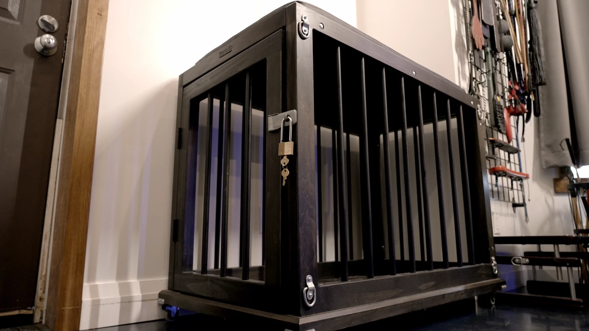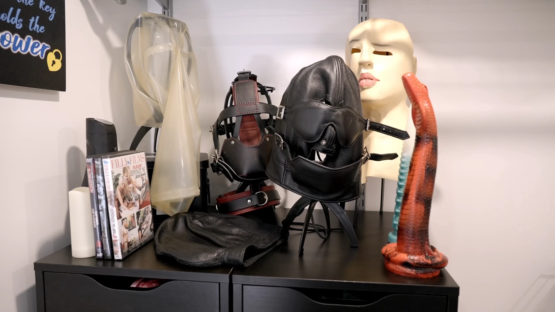 Предметы для феминизации (три контейнера в шкафу с париками, одеждой разных размеров и нижним бельём)