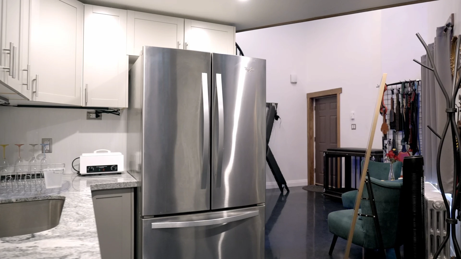 В основе пространства — большая игровая зона и изящная винтовая лестница, ведущая на антресоль с открытой спальней, откуда через балкон просматривается весь зал, позволяя проводить игры одновременно на обоих уровнях. На первом этаже расположены кухня открытой планировки и полноценная ванная комната с просторным душем.